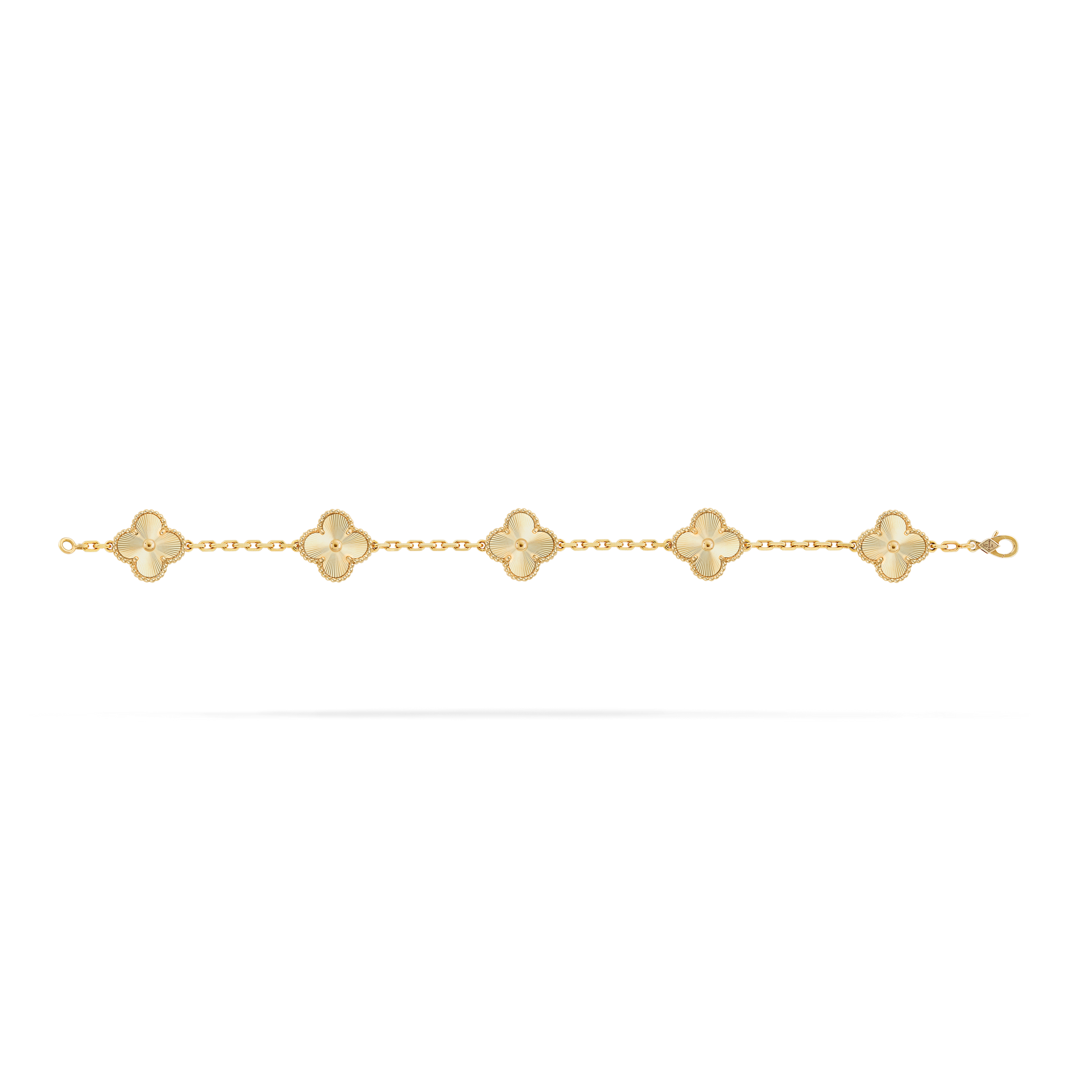 צמיד אלהמברה וינטג' במהדורת גילוֹשה יוקרתי, המחבר אומנות מסורתית עם מגע זהוב של 18 קראט. חמשת המוטיבים של הצמיד מעוצבים בטכניקת הגילוֹשה הקלאסית – חריטה מעודנת של קווים אלגנטיים המעניקים לכל מוטיב ברק מיוחד ומרקם מרהיב. תכשיט זה הוא מופת של עיצוב והשראה, נושא עמו תחושת נצחיות ויוקרה שנוגעים בלב ונשארים על העור.